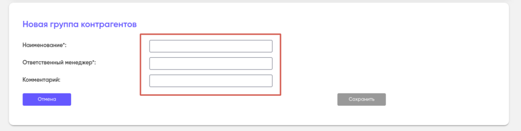 В открывшейся форме дайте название новой группе, выберите ответственного менеджера и добавьте комментарий к группе (по желанию). Нажмите «Сохранить».