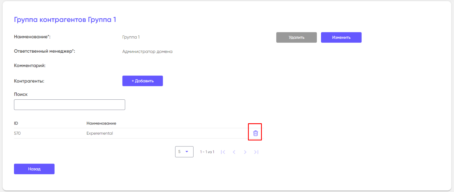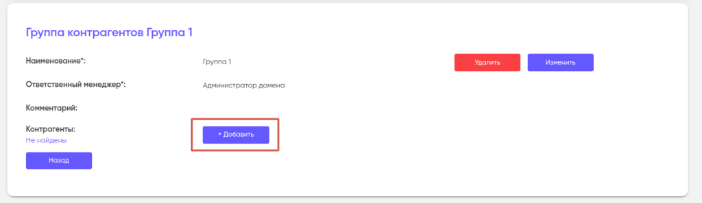 Обратите внимание, что после добавления в группу хотя бы одного контрагента, кнопка «Удалить» группу станет неактивной. Для того, что бы кнопка удаления группы вновь стала активной, сначала удалите из группы всех контрагентов.