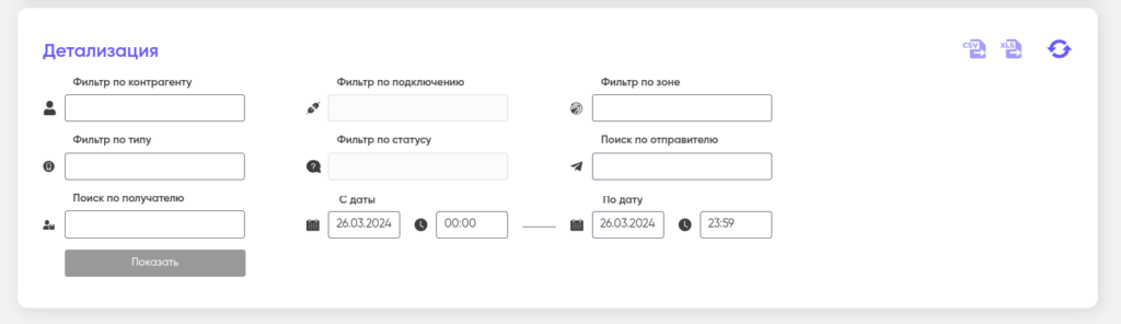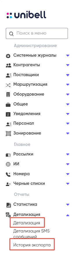 Подробнее о детализации и истории экспорта см. «Детализация и история экспорта» в разделе «Личный кабинет» на примере пользователя.