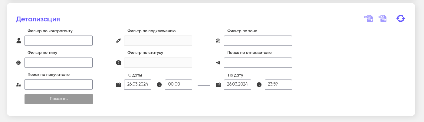 Подробнее о детализации и истории экспорта см. «Детализация и история экспорта» в разделе «Личный кабинет» на примере пользователя.