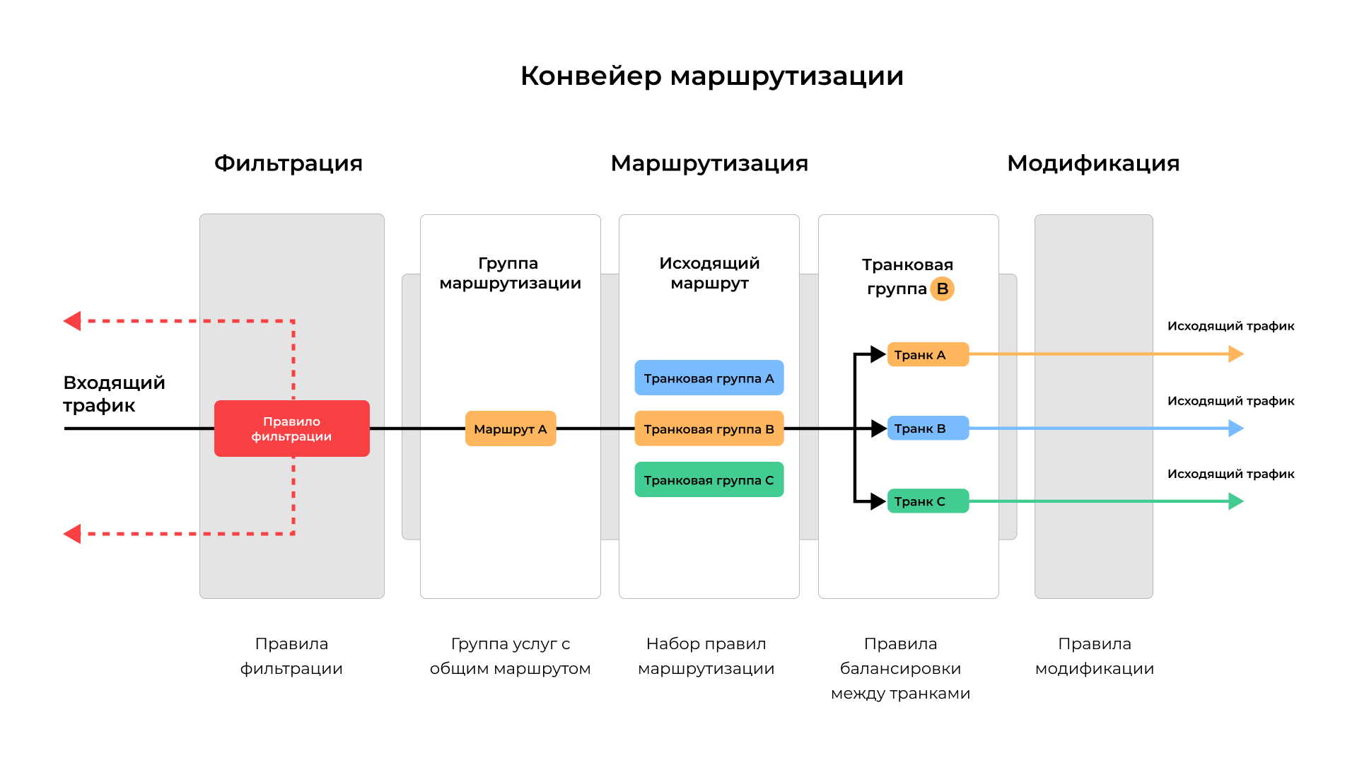 Трафик в системе маршрутизируется по принципу конвейера маршрутизации.