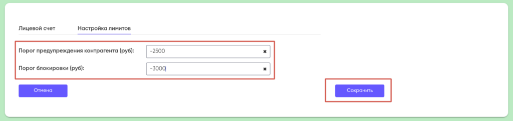 В настройках лимитов для каждого контрагента указываются следующие параметры: