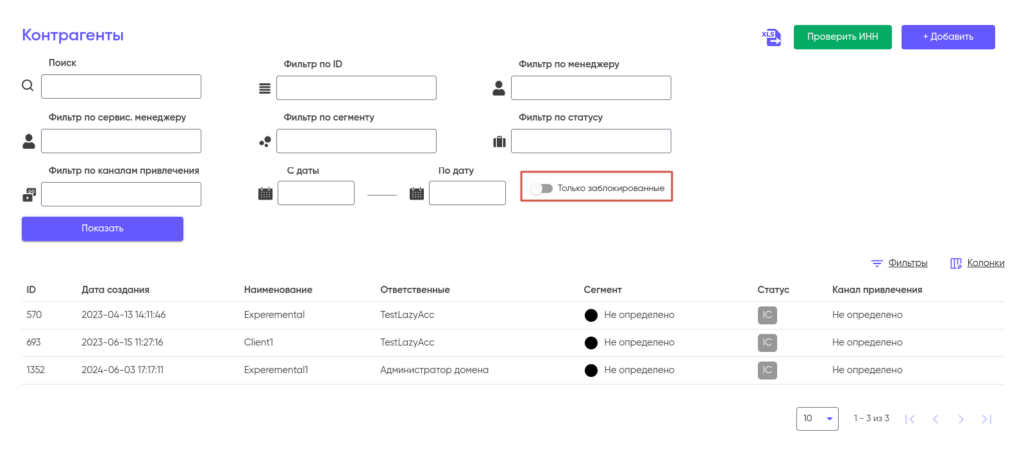В списке контрагентов доступен фильтр, который позволяет отобразить только заблокированных контрагентов.