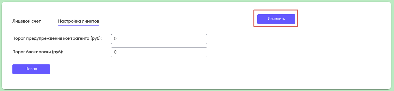 Если вы хотите выставить лимиты на контрагента, нажмите кнопку «Изменить» рядом с соответствующими параметрами и укажите необходимые значения.