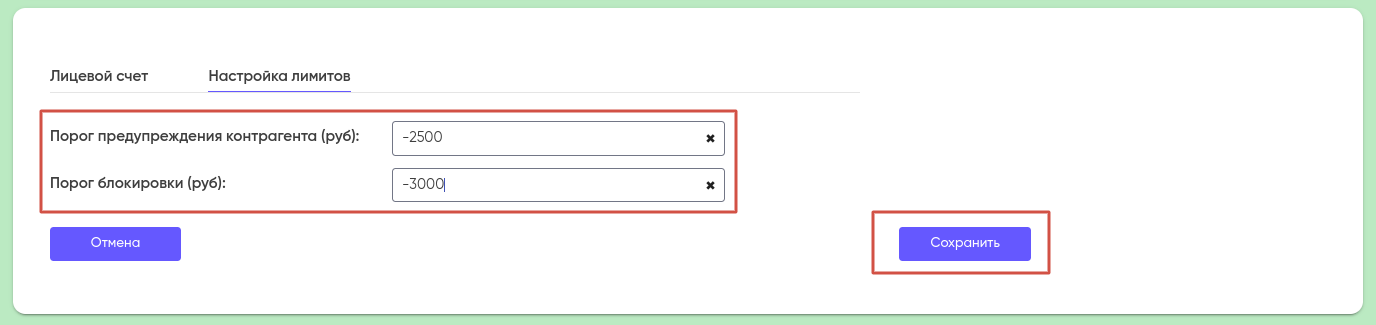В настройках лимитов для каждого контрагента указываются следующие параметры: