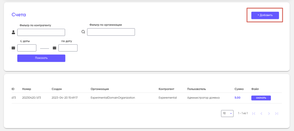 После выставления счета, система автоматически сгенерирует pdf-файл, доступный для скачивания в личном кабинете администратора и в личных кабинетах контрагентов, на чье имя был выставлен счет.