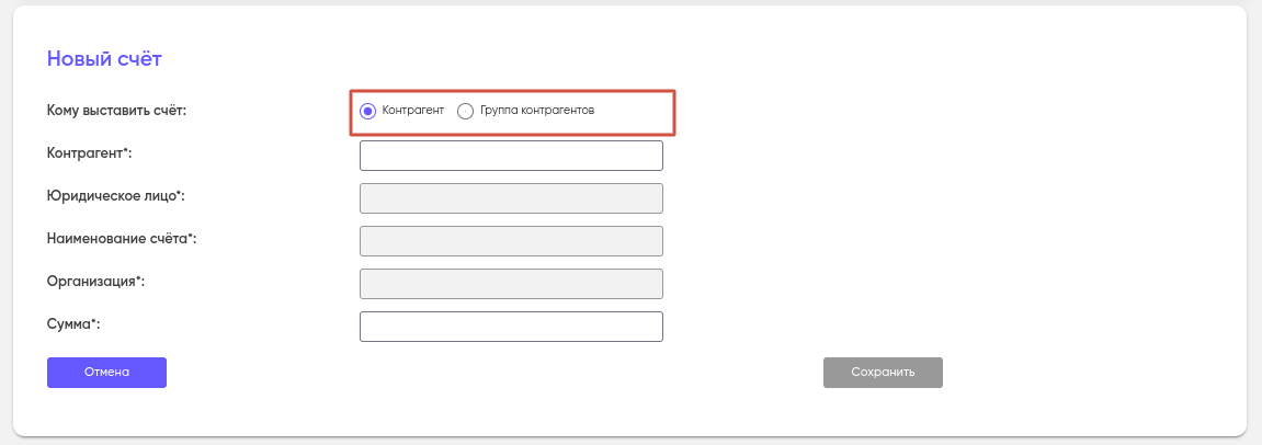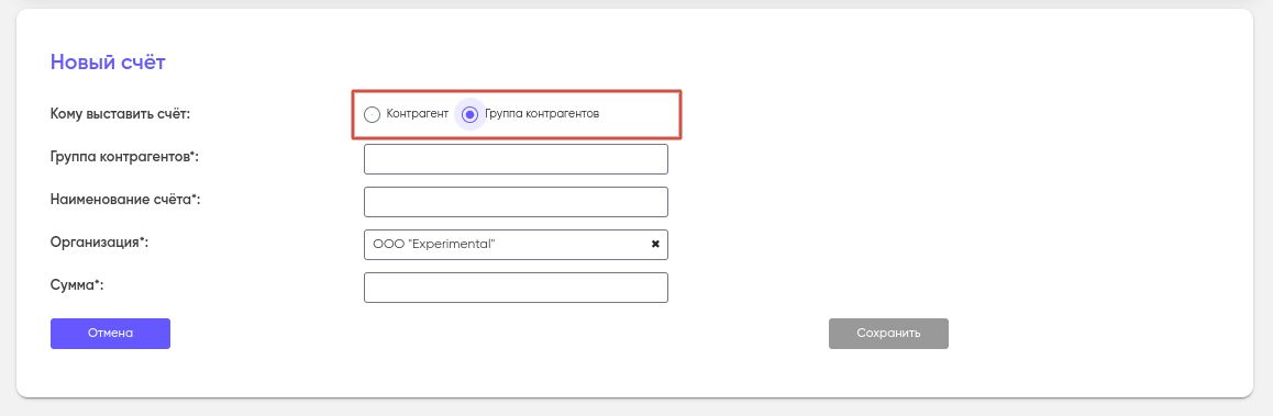 Счет может быть выставлен контрагенту или группе контрагентов.