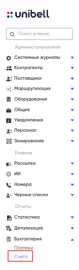 Администратор системы имеет возможность выставления счетов на оплату услуг контрагентам.