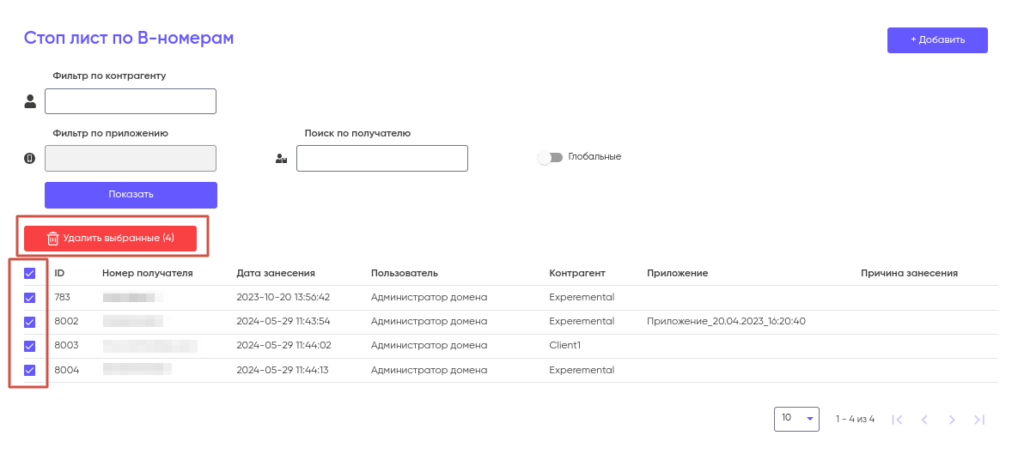 Используйте доступные фильтры для выбора контрагента и приложения. Просмотрите номера, которые были добавлены в черный список для данного приложения, нажав кнопку «Показать».