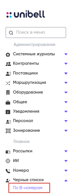 Для управления черными списками перейдите в пункт “По B-номерам”, находящемся в разделе “Черные списки”.