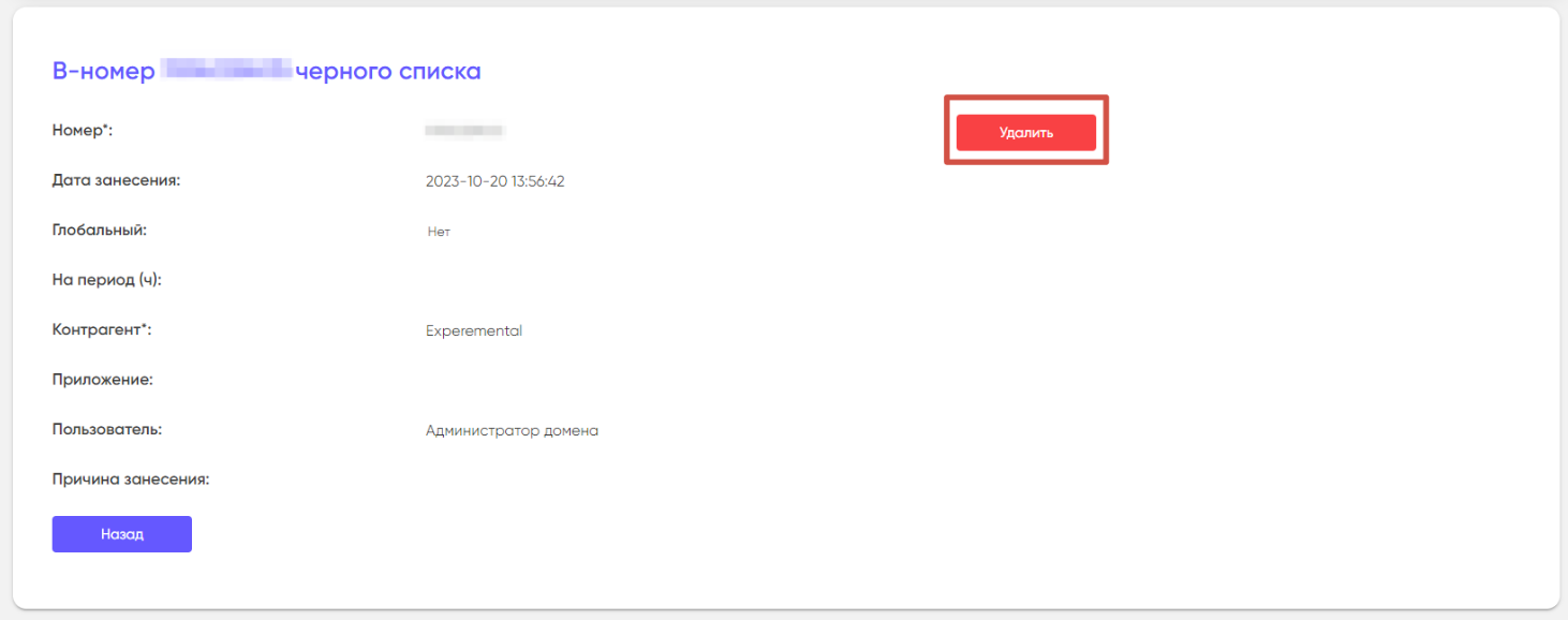 Для того чтобы удалить тот или иной номер из черного списка, найдите его в общем списке (используйте фильтры). Нажмите на него, и на открывшейся странице нажмите «Удалить». Также доступна массовая очистка списка. С помощью фильтров можно удалить номера по определенному контрагенту и приложению.