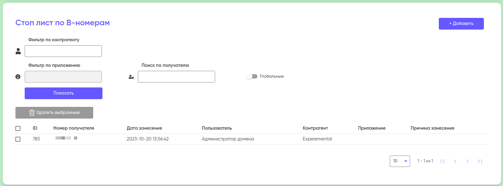 В свою очередь, Администратор системы может видеть все номера, которые были добавлены контрагентами в их черные списки. Администратор может самостоятельно добавлять номера в черный список контрагентов и удалять номера из него.