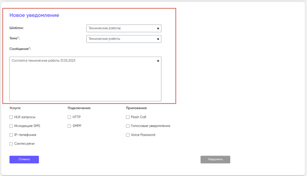 В открывшейся странице укажите Тему уведомления, выберите Тип уведомления и напишите Текст .