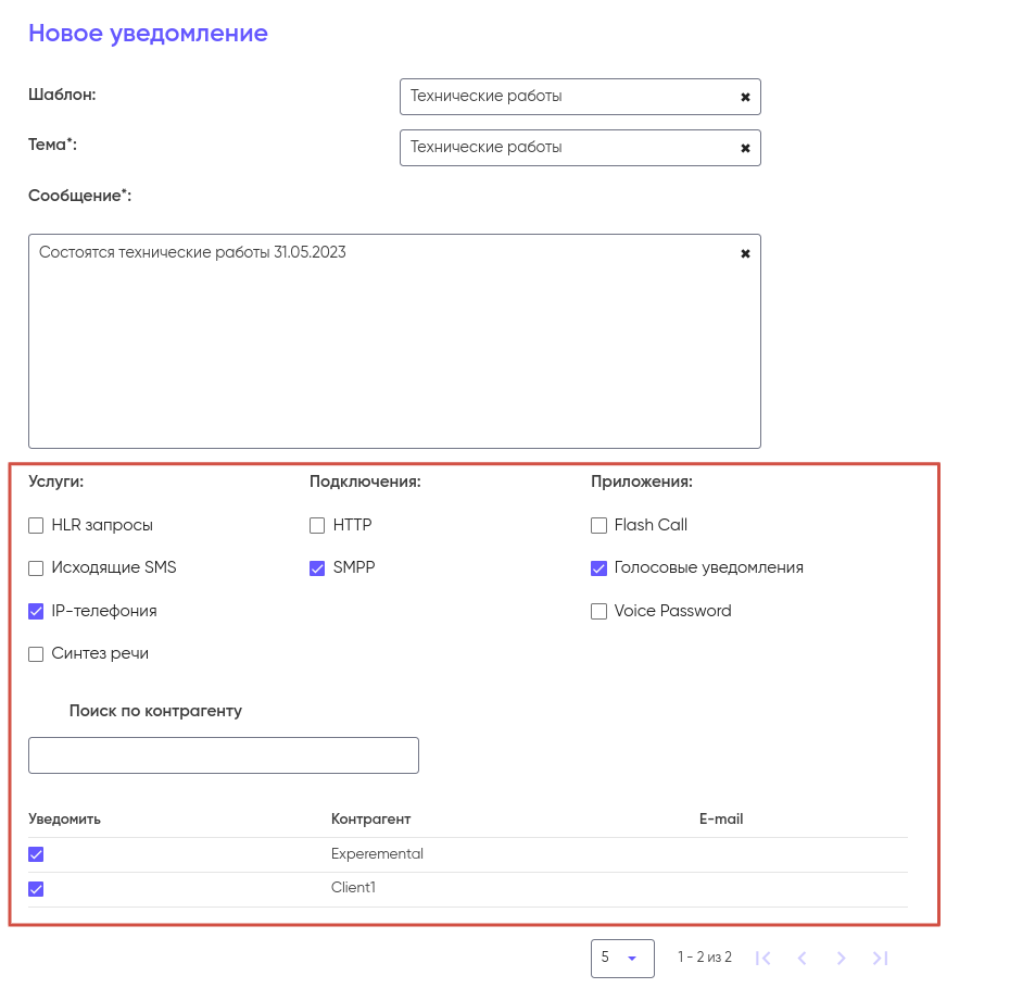 Для этого установите одну или несколько галочек напротив тех Услуг, Подключений и Приложений, которые будут затронуты данным уведомлением. На основании отмеченных галочек ниже появится список контрагентов, у которых подключены отмеченные Приложения/Услуги. По умолчанию все контрагенты в списке будут отмечены для получения уведомления. Если требуется исключить какого-либо контрагента из рассылки, снимите с него галочку. Если список слишком большой, воспользуйтесь поиском.