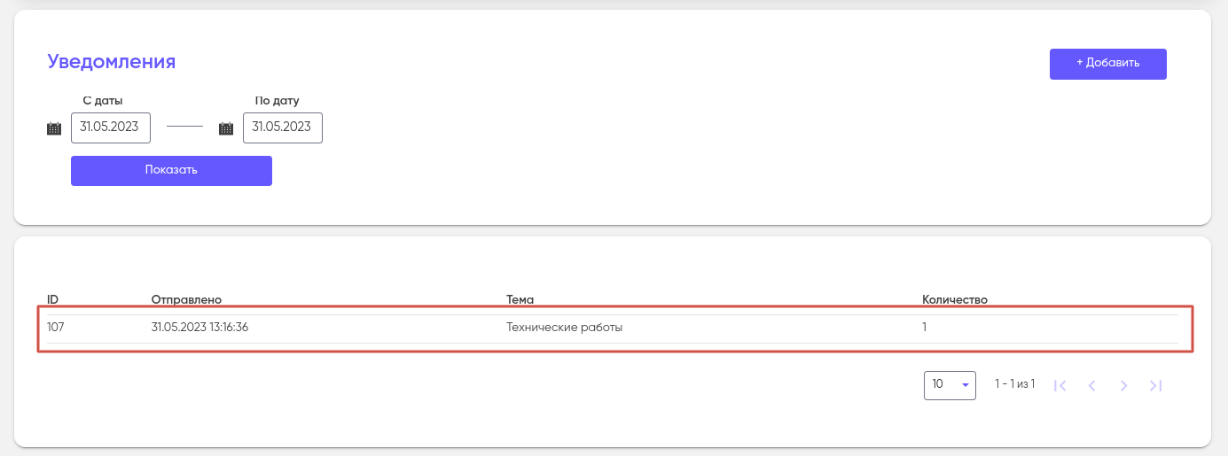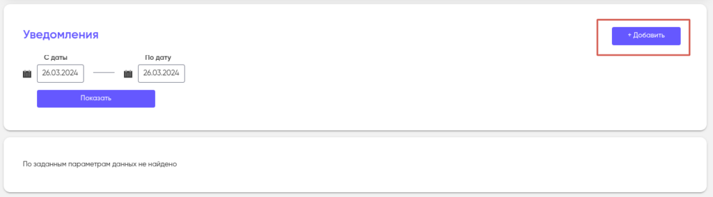 Для того что бы отправить уведомление контрагентам перейдите в соответствующий раздел и на открывшейся странице нажмите «+ Добавить».