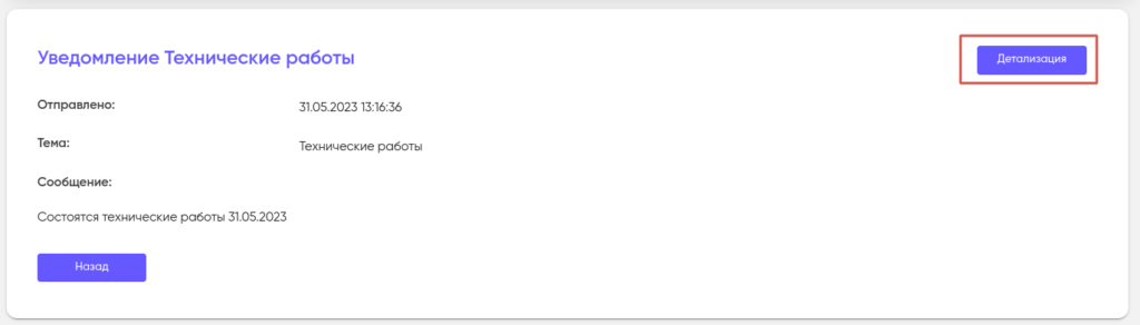 Для того что бы просмотреть отчет о доставке уведомлений, нажмите на нее и перейдите в «Детализация».
