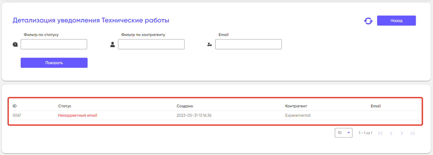 В детализации вы увидите список всех контрагентов отмеченных к рассылке и статус доставки уведомления.