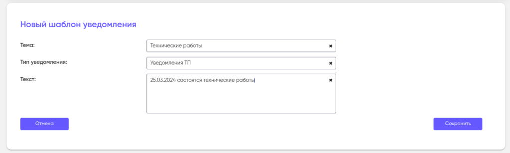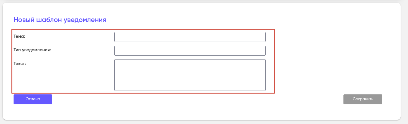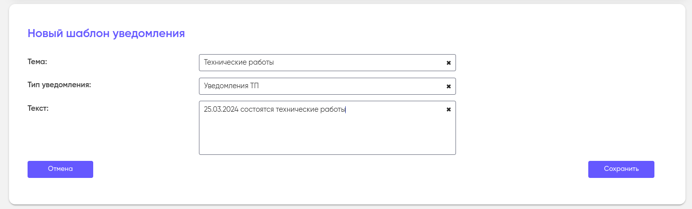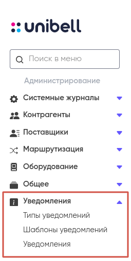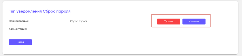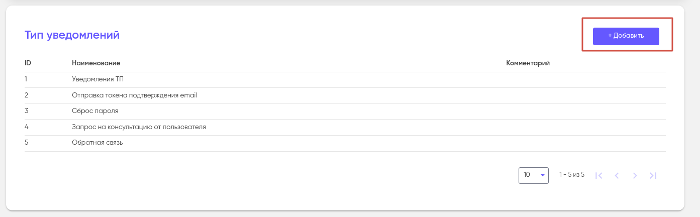 В разделе «Типы уведомлений» хранится справочник типов уведомлений. Администратор может создавать, изменять и удалять типы уведомлений.