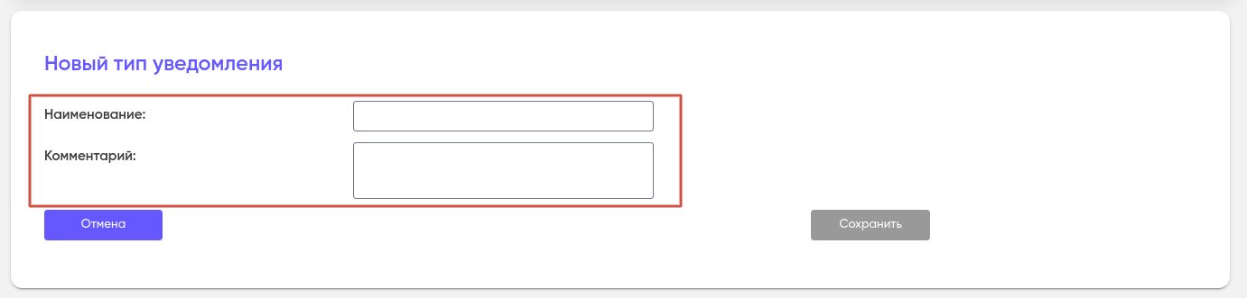Введите Наименование для нового типа уведомления и Комментарий (по желанию). Нажмите на «Сохранить». Новый тип уведомления будет создан.