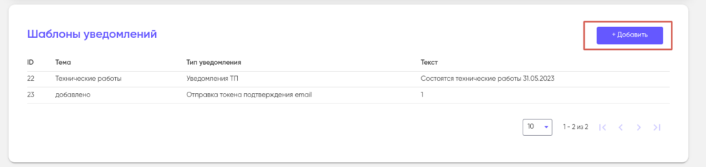 Для создания шаблона в разделе «Шаблоны уведомлений» нажмите на соответствующий пункт меню и нажмите «+ Добавить».
