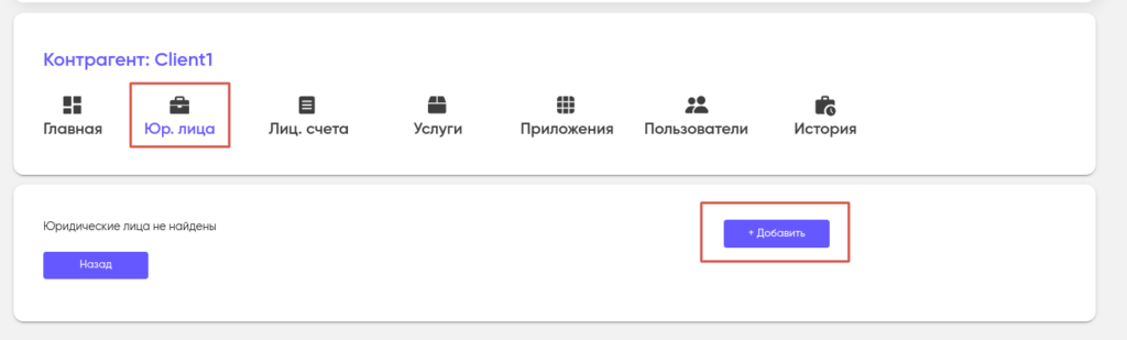 Добавление юридического лица для контрагента происходит на странице «Контрагенты» во вкладке «Юр. лица» (Юридические лица).