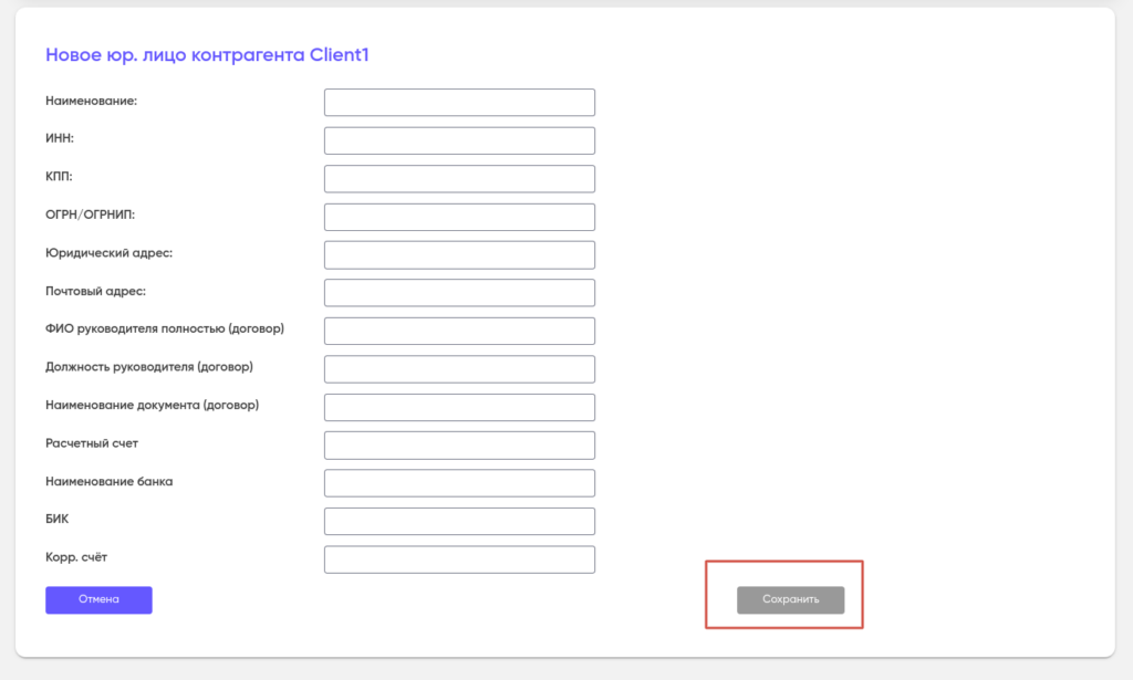В открывшейся форме заполните поля данными о юридическом лице и нажмите «Сохранить».