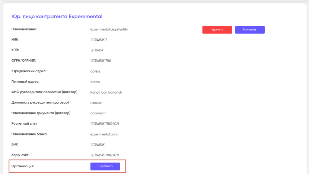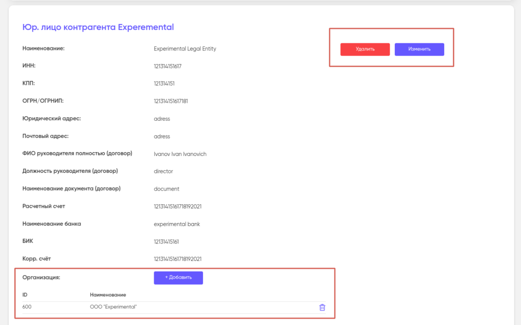 Юридическое лицо в дальнейшем может быть изменено или удалено. Для этого перейдите в него и нажмите «Изменить» или «Удалить».