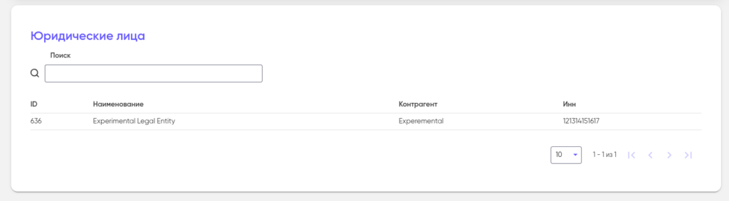 Раздел «Юридические лица» содержит список всех юридических лиц контрагентов, добавленных в систему.