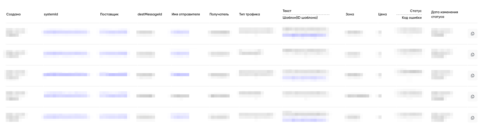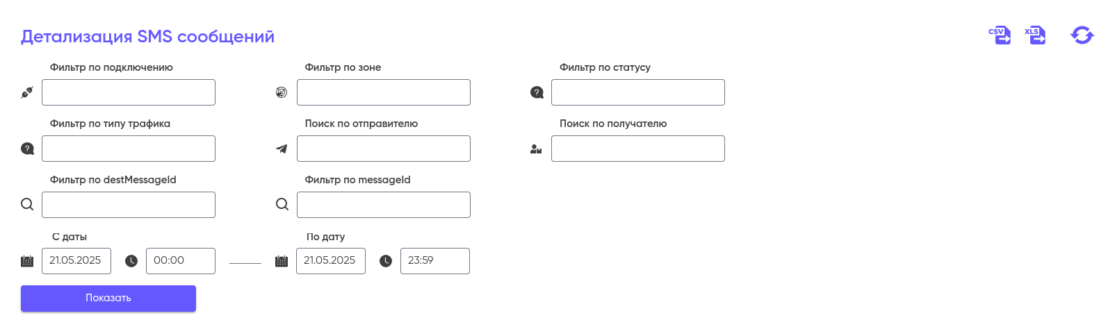 Инструмент детализации SMS-сообщений позволяет вывести подробный отчет об отправленных пользователем личного кабинета SMS за указанный период в виде онлайн-таблицы с возможностью экспорта в CSV или XLS.