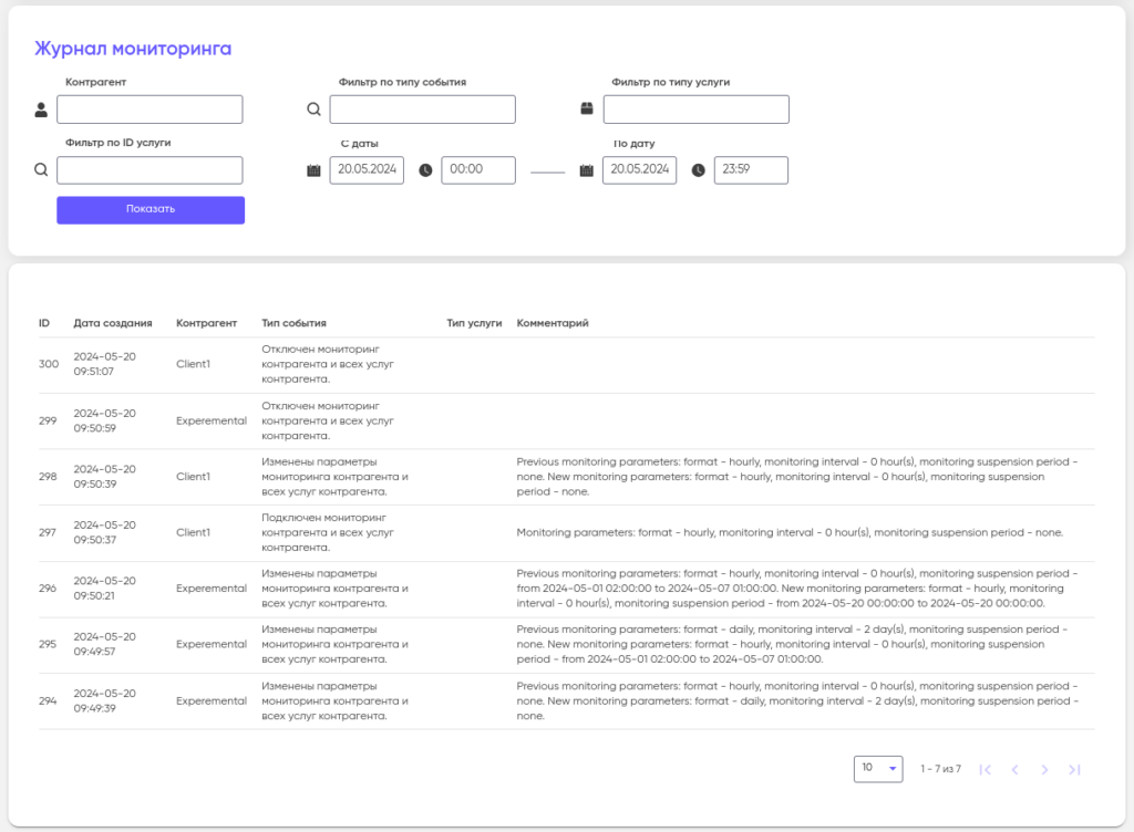 В журнале мониторинга регистрируются сведения о дате создания, типах события и услуги, а также указывается комментарий. Эти данные используются для анализа текущего состояния, выявления изменений в процессе или состоянии, а также оценки эффективности мониторируемого объекта.