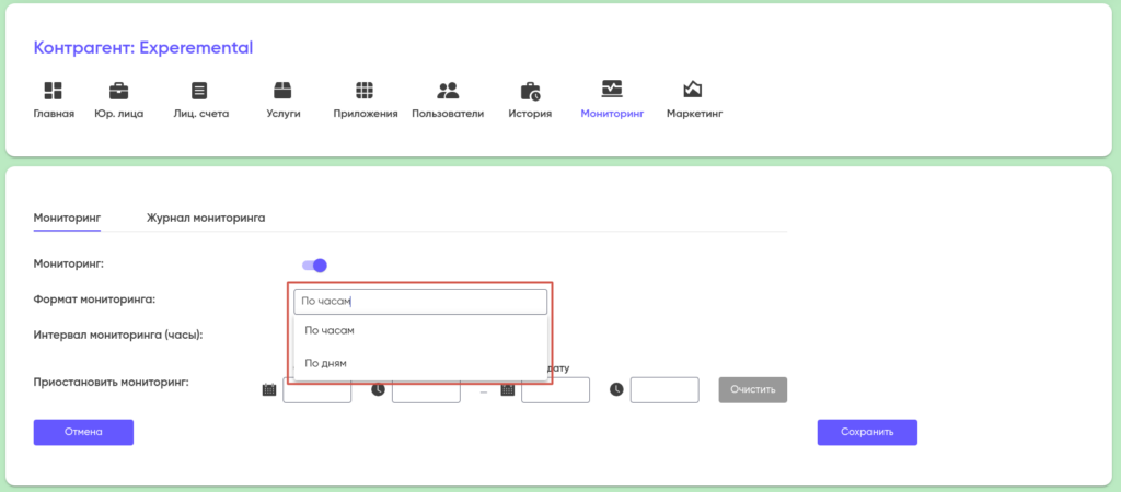 «Формат мониторинга» доступен «По часам» и «По дням».