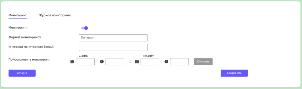 В открывшемся окне у вас есть возможность отключить мониторинг, изменить формат, настроить интервал и указать даты, в течение которых его следует приостановить. После внесения изменений нажмите кнопку «Сохранить».