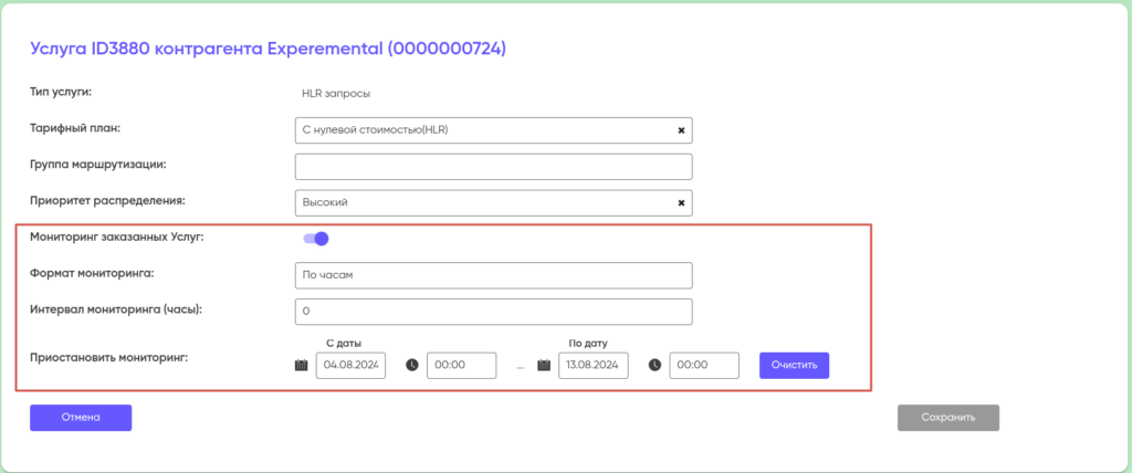 Эти настройки будут применены только к выбранной услуге, изменения не затронут настройки мониторинга в карточке контрагента.