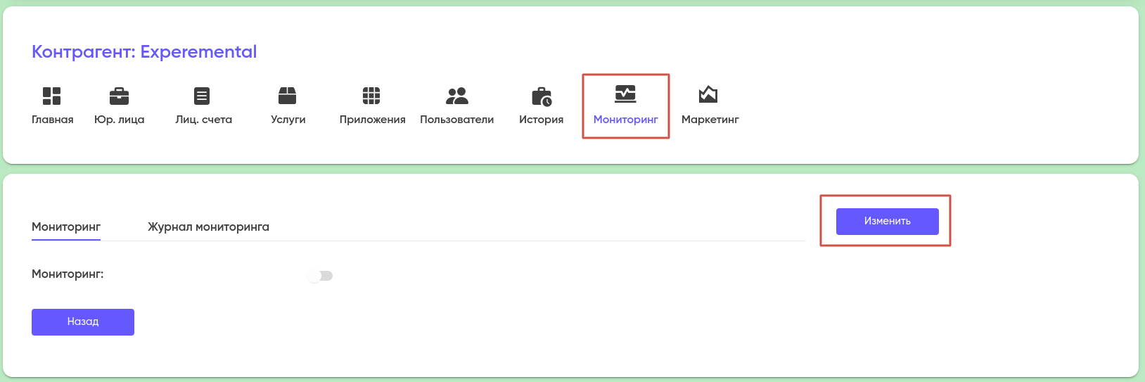 Для ее активации необходимо перейти в раздел «Контрагенты», выбрать раздел «Мониторинг» и нажать на кнопку ‘Изменить’.