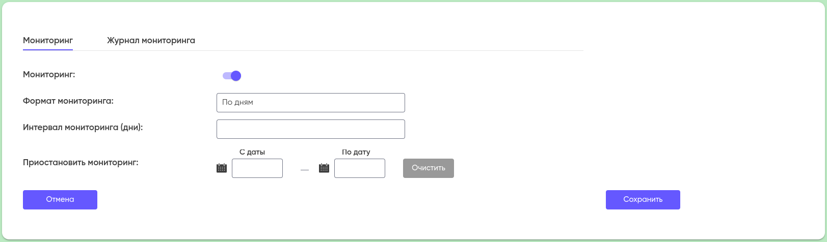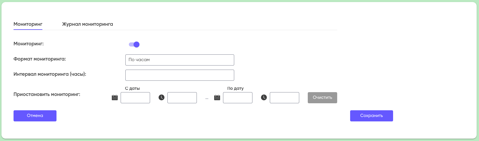 В открывшемся окне у вас есть возможность отключить мониторинг, изменить формат, настроить интервал и указать даты, в течение которых его следует приостановить. После внесения изменений нажмите кнопку «Сохранить».