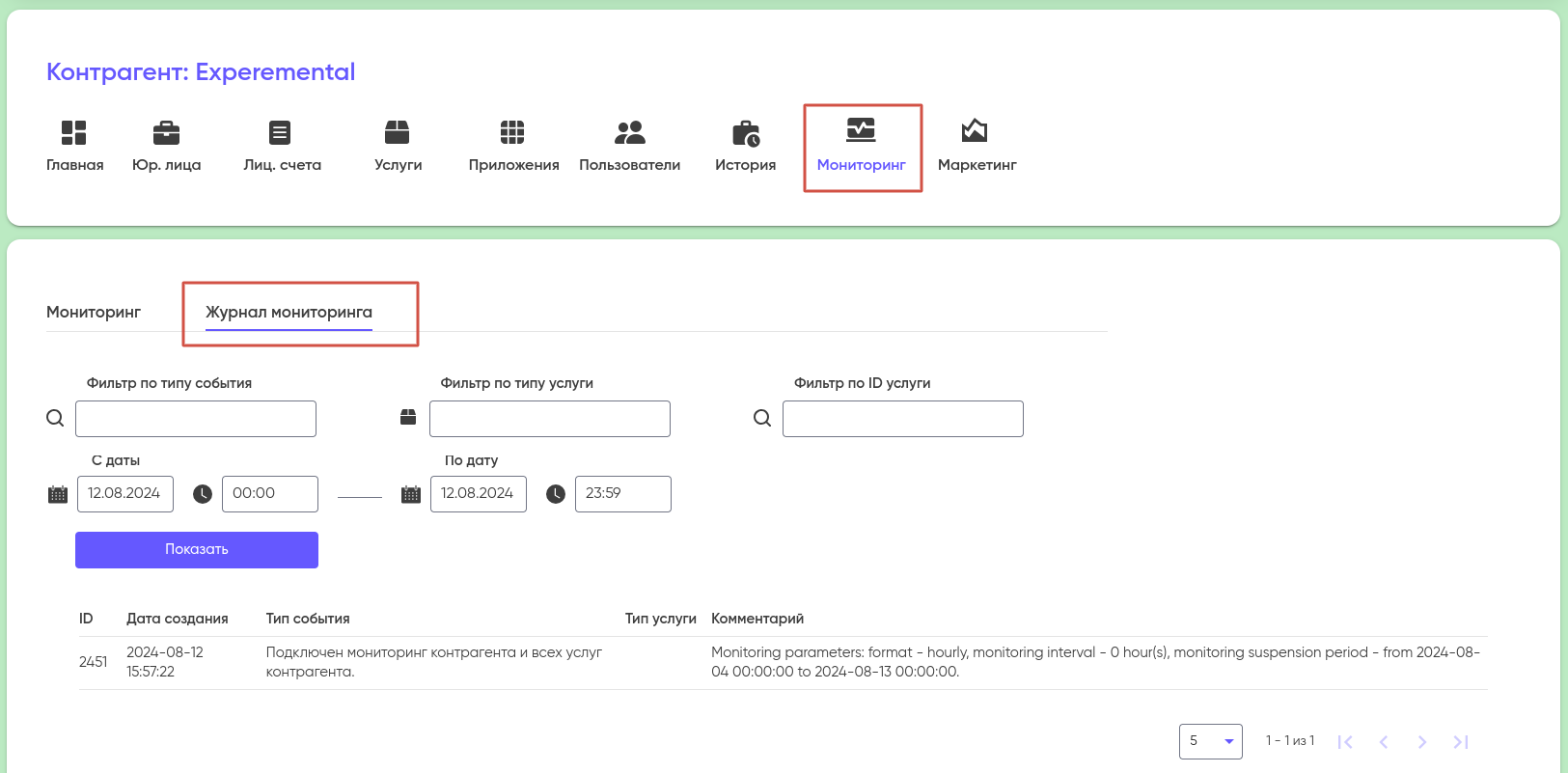 В разделе «Системные журналы» доступен «Журнал мониторинга», в котором отображаются события по контрагентам.