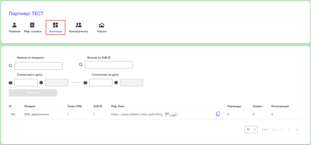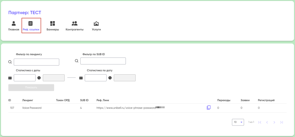 В разделе «Реф. ссылки» содержатся все ссылки, которые были добавлены партнеру (подробнее см. Реферальные ссылки):