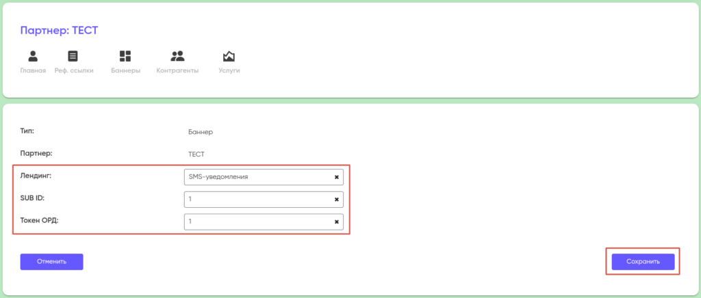 При нажатии на ссылку из списка откроется ее карточка, где можно внести изменения. Для этого нажмите «Изменить» — откроется окно, в котором можно изменить данные Лендинга, SUB ID и Токен ОРД. После внесения измнений нажмите «Сохранить».