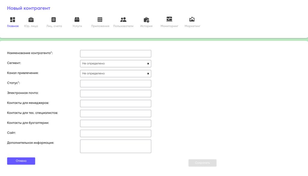 Добавление контрагента для партнера соответствует добавлению контрагента в биллинг (см. Контрагенты):