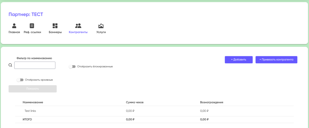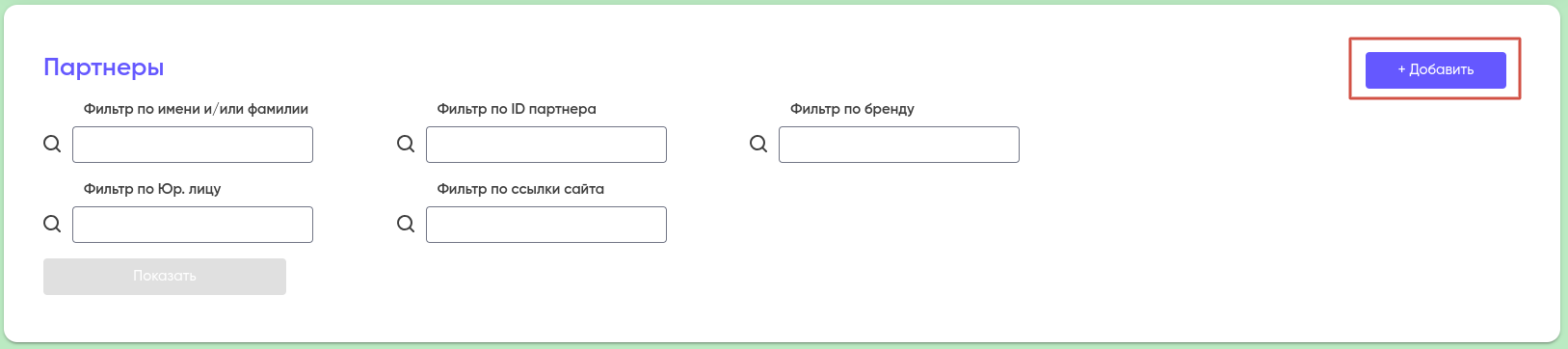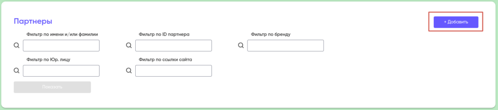 Чтобы создать новый профиль партнера, нажмите на кнопку «+ Добавить» в правом верхнем углу страницы.