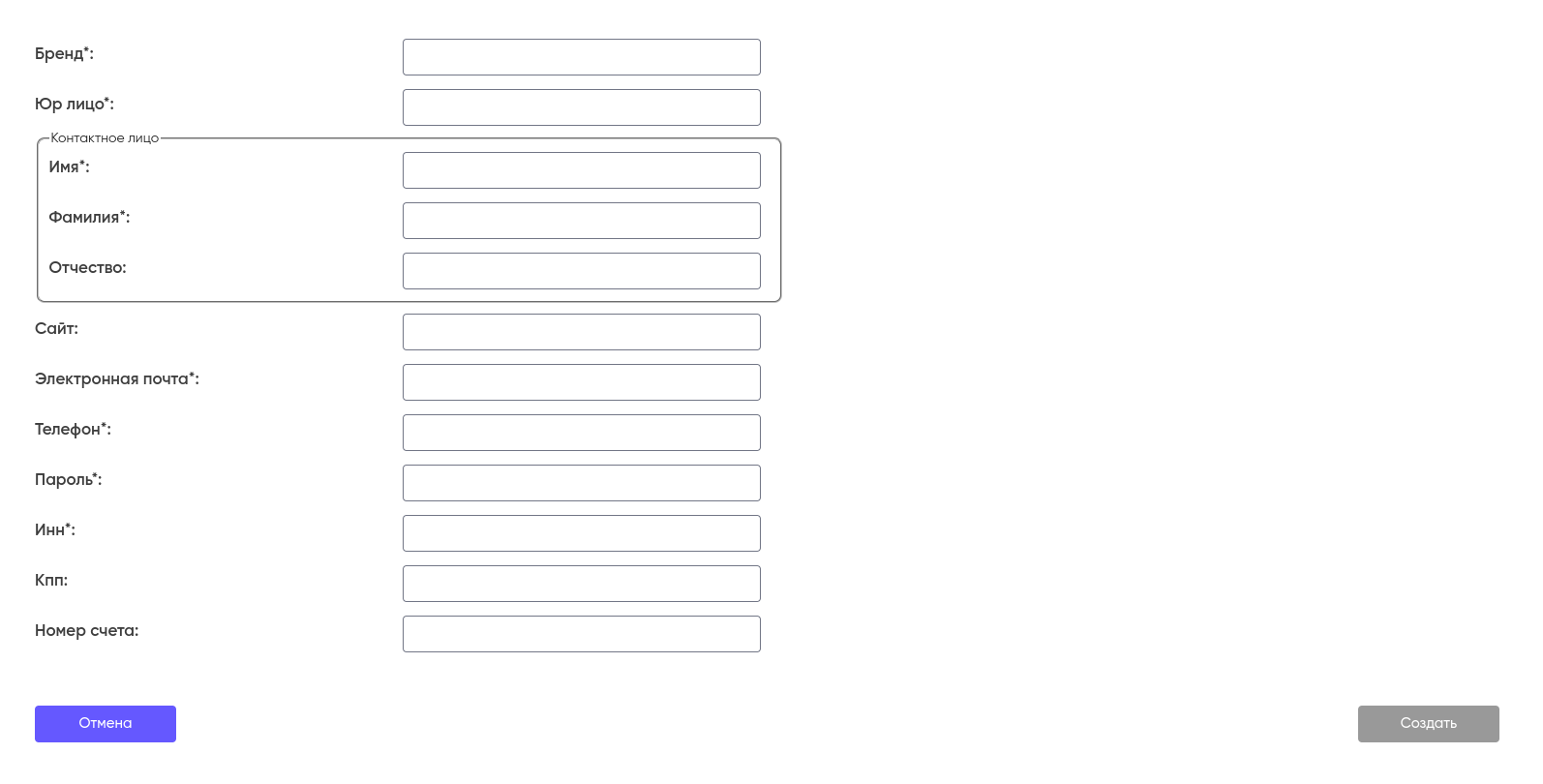 После чего на открывшейся странице заполните представленные поля. Обязательными для заполнения являются поля Бренд, Юр. лицо, Имя, Фамилия, Электронная почта, Телефон, Пароль, ИНН.