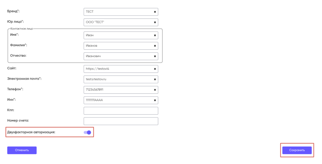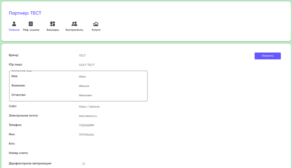 В дальнейшем, нажав «Изменить», вы можете изменить информацию о партнере, а также включить или выключить двухфакторную авторизацию (SMS-код на номер телефона при входе на сайте) переключив соответсвующий ползунок. Для сохранения изменений нажмите «Сохранить»: