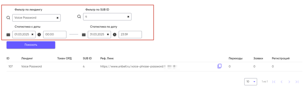 В данном разделе можно воспользоваться фильтрами, например, отфильтровать ссылки по определенному лендингу и/или SUB ID, а также вывести ссылки, добавленные в определенный период даты.