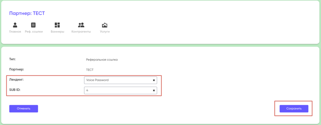 При нажатии на ссылку из списка откроется ее карточка, где можно внести изменения. Для этого нажмите «Изменить» — откроется окно, в котором можно изменить данные Лендинга и SUB ID. После внесения измнений нажмите «Сохранить».