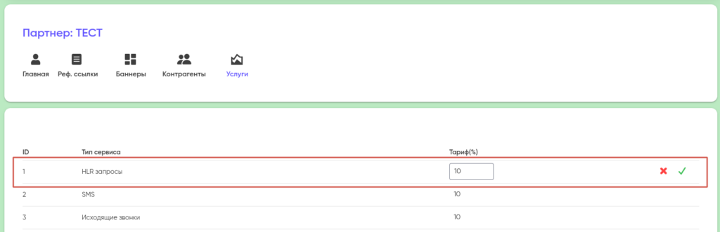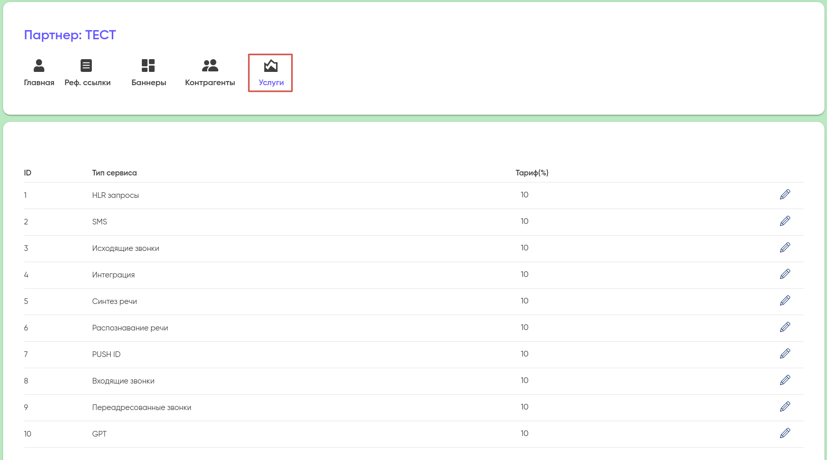 Вкладка «Услуги» содержит перечень доступных Услуг и процентную ставку вознаграждения (Тариф), которую партнер получает за их рекламу: