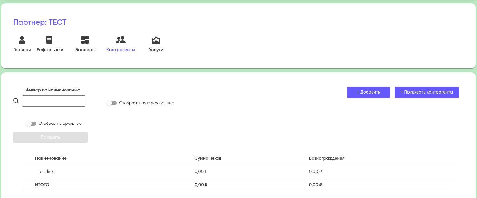 Вкладка «Контрагенты» содержит список всех контрагентов, добавленных в систему для определенного партнера.