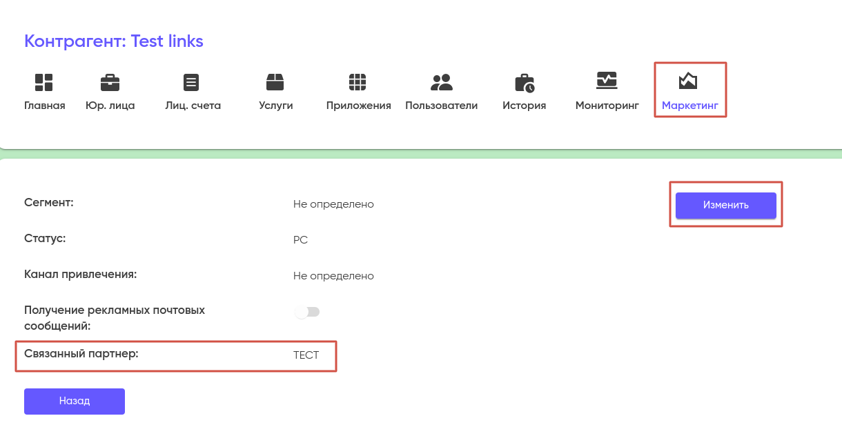 Для этого перейдите в нужного контрагента, затем во вкладку «Маркетинг». Затем нажмите «Изменить» и в поле «Связанный партнер» выбере партнера из выпадающего списка, с которым необходимо связать контрагента и нажмите «Сохранить».