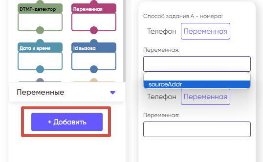 Для этого предусмотрены две системные переменные: sourceAddr (для входящих сценариев) и destAddr (для исходящих сценариев). В зависимости от того является ваш сценарий входящим или исходящим, добавьте в него одну из этих переменных, после чего выберите ее в выпадающем списке во вкладке «Переменная» в блоке настроек «Способ задания А — номера».
