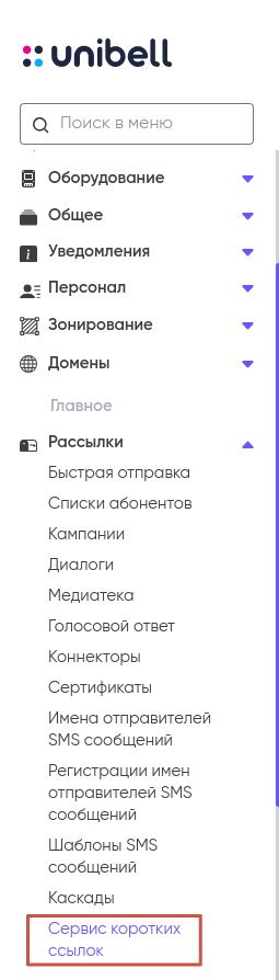 В меню выберите раздел «Сервис коротких ссылок»: