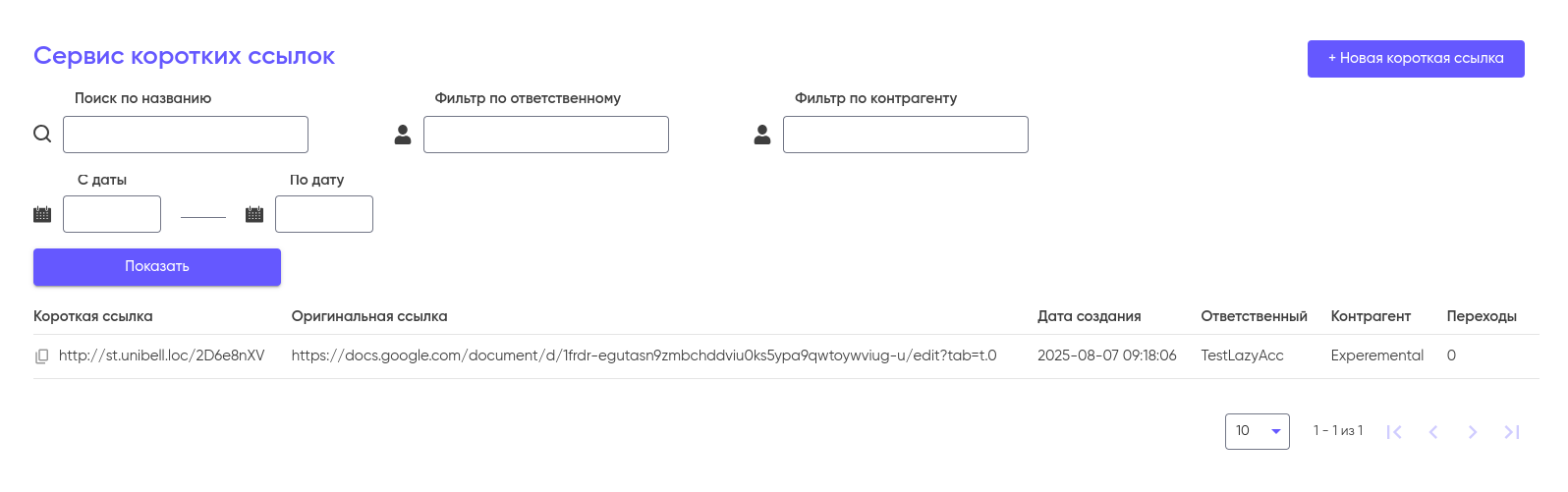 В разделе отображается список всех добавленных коротких ссылок: